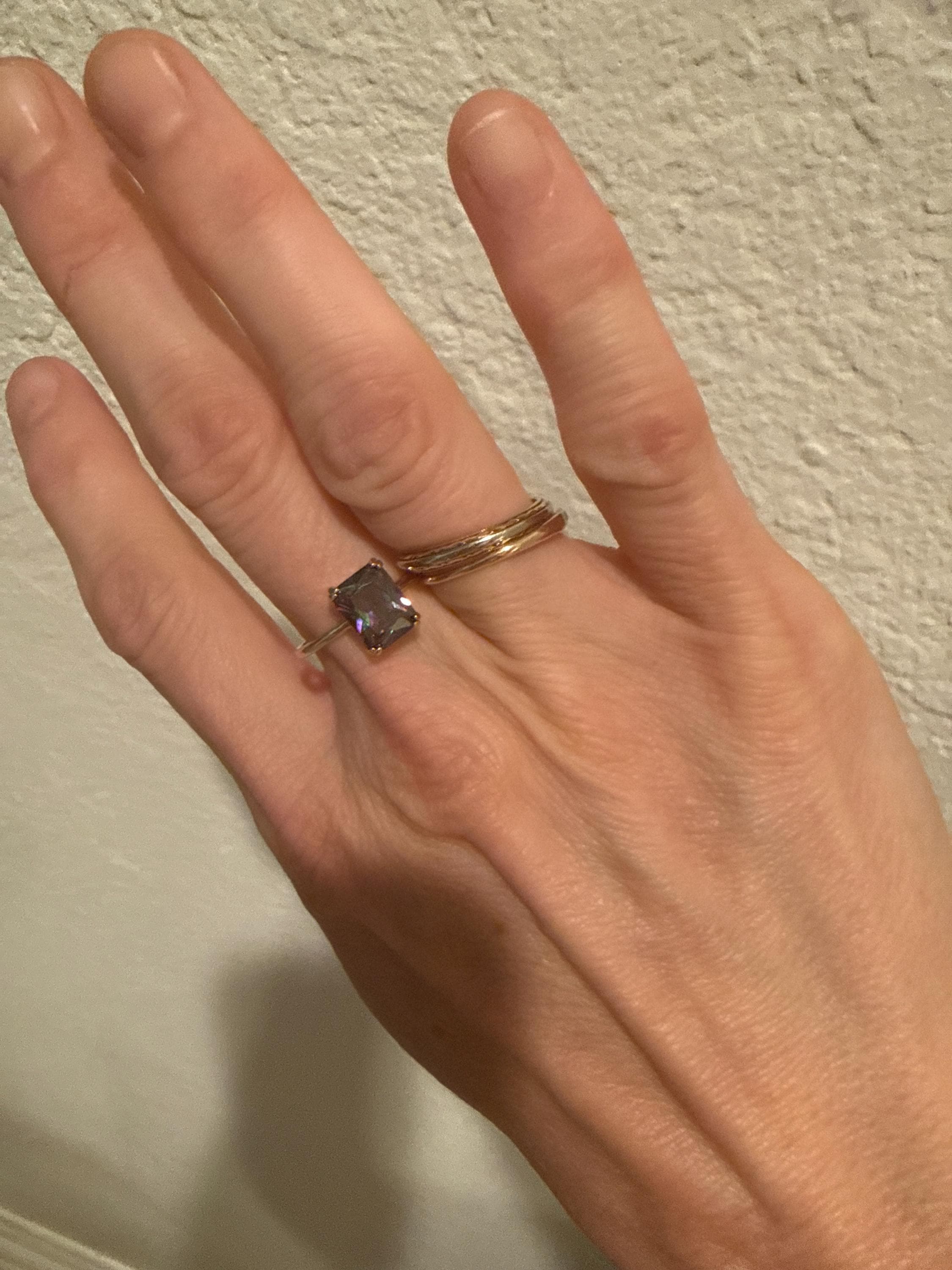 This ring features a vibrant emerald-cut mystic topaz that shimmers with a rainbow of colors—purple, green, blue, and flashes of pink—changing beautifully as the light hits. Set in a sleek four-prong setting on a delicate gold band, this piece is perfect for anyone who loves unique and eye-catching jewelry.