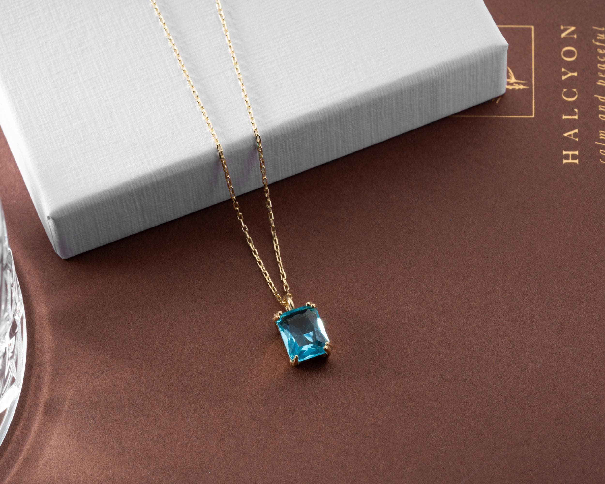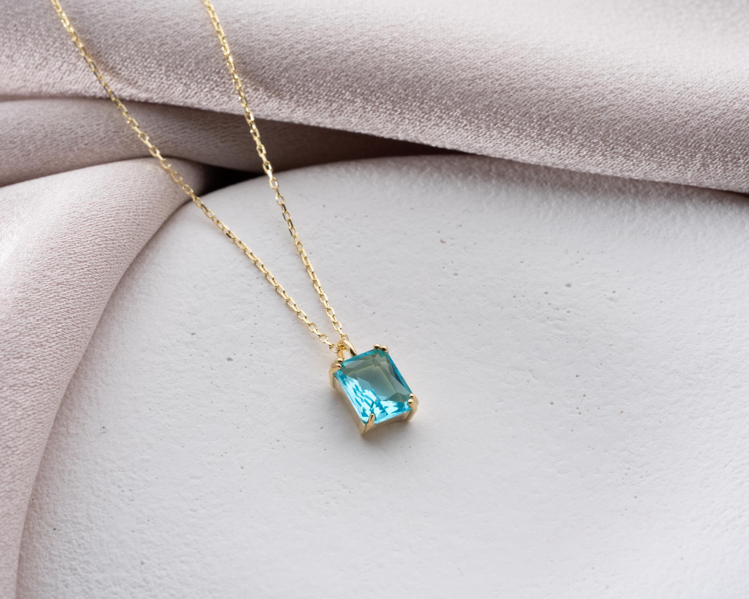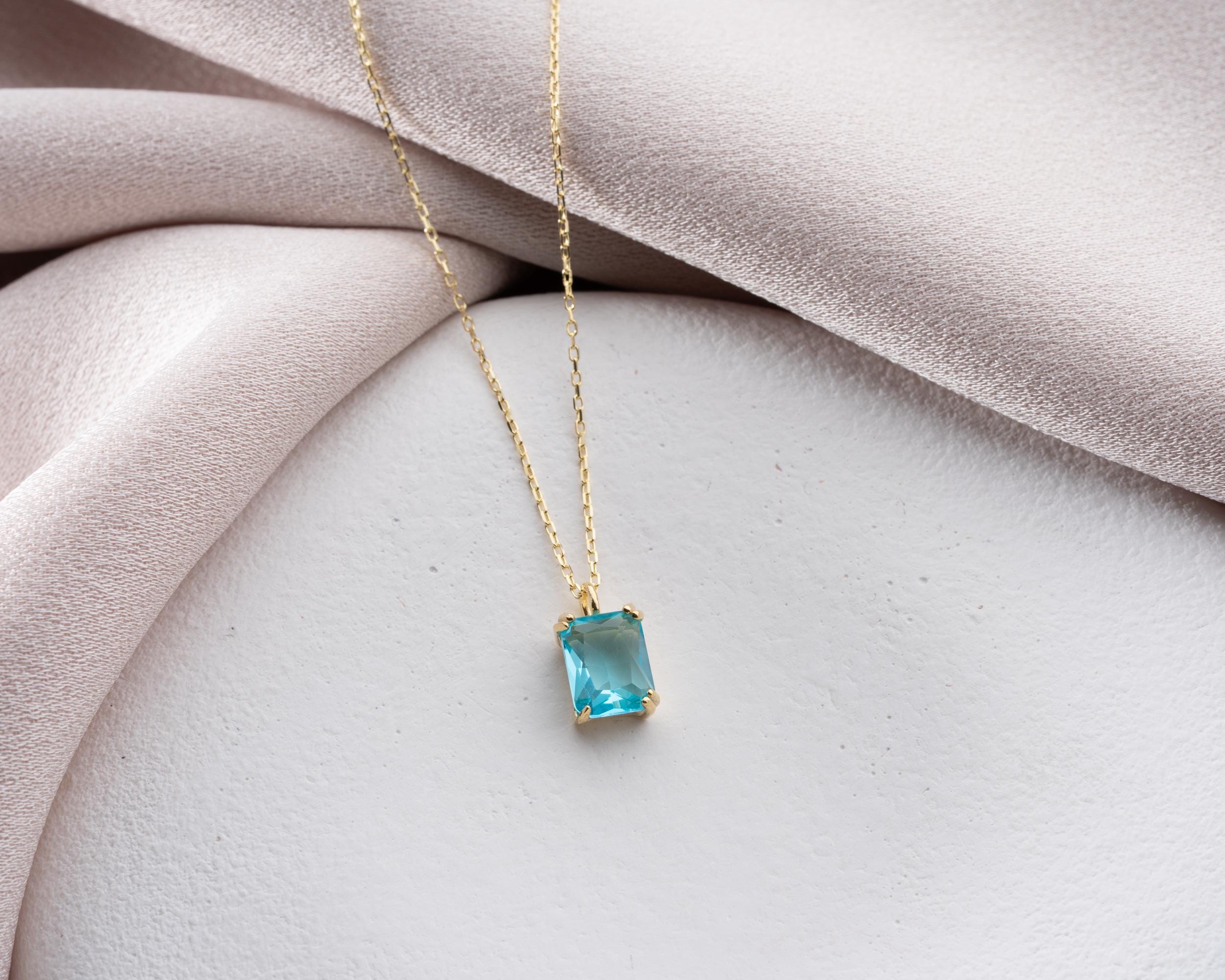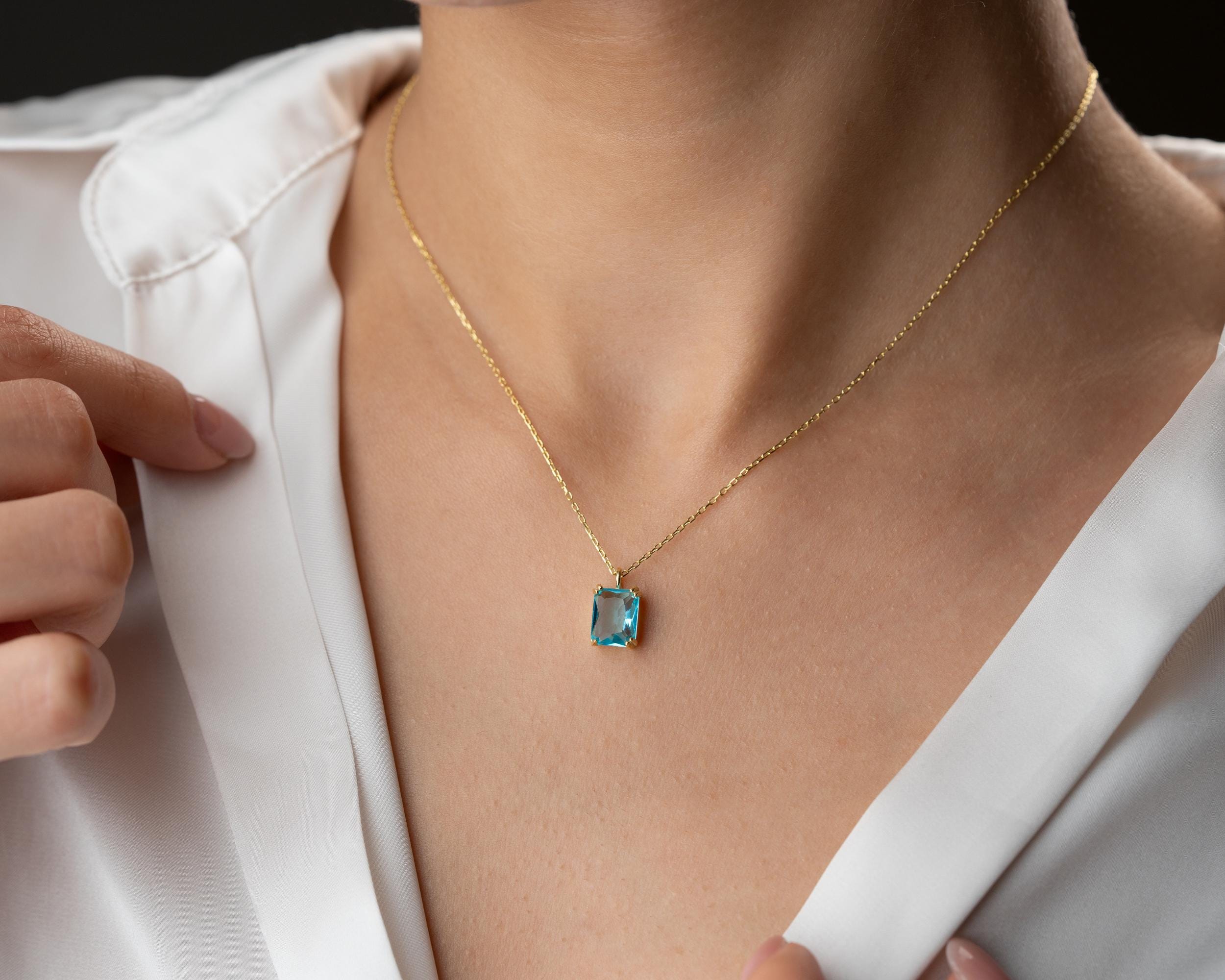 Delicate, radiant, and effortlessly elegant — this aquamarine blue pendant necklace brings a refreshing touch of ocean-inspired calm to your jewelry collection. The emerald-cut cubic zirconia stone (7x9mm) sparkles with a cool sky-blue hue, capturing light with every movement and reflecting tranquility and grace.