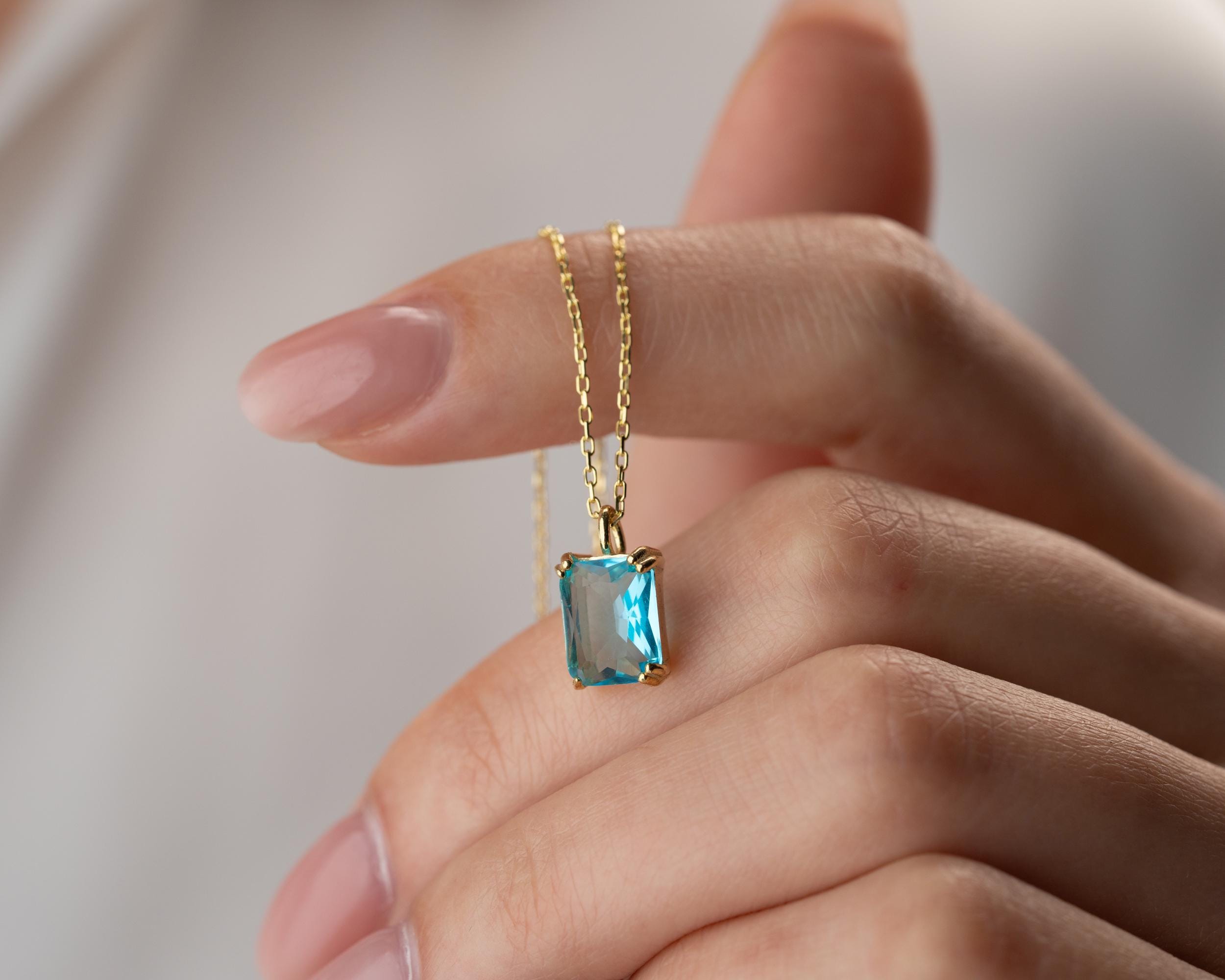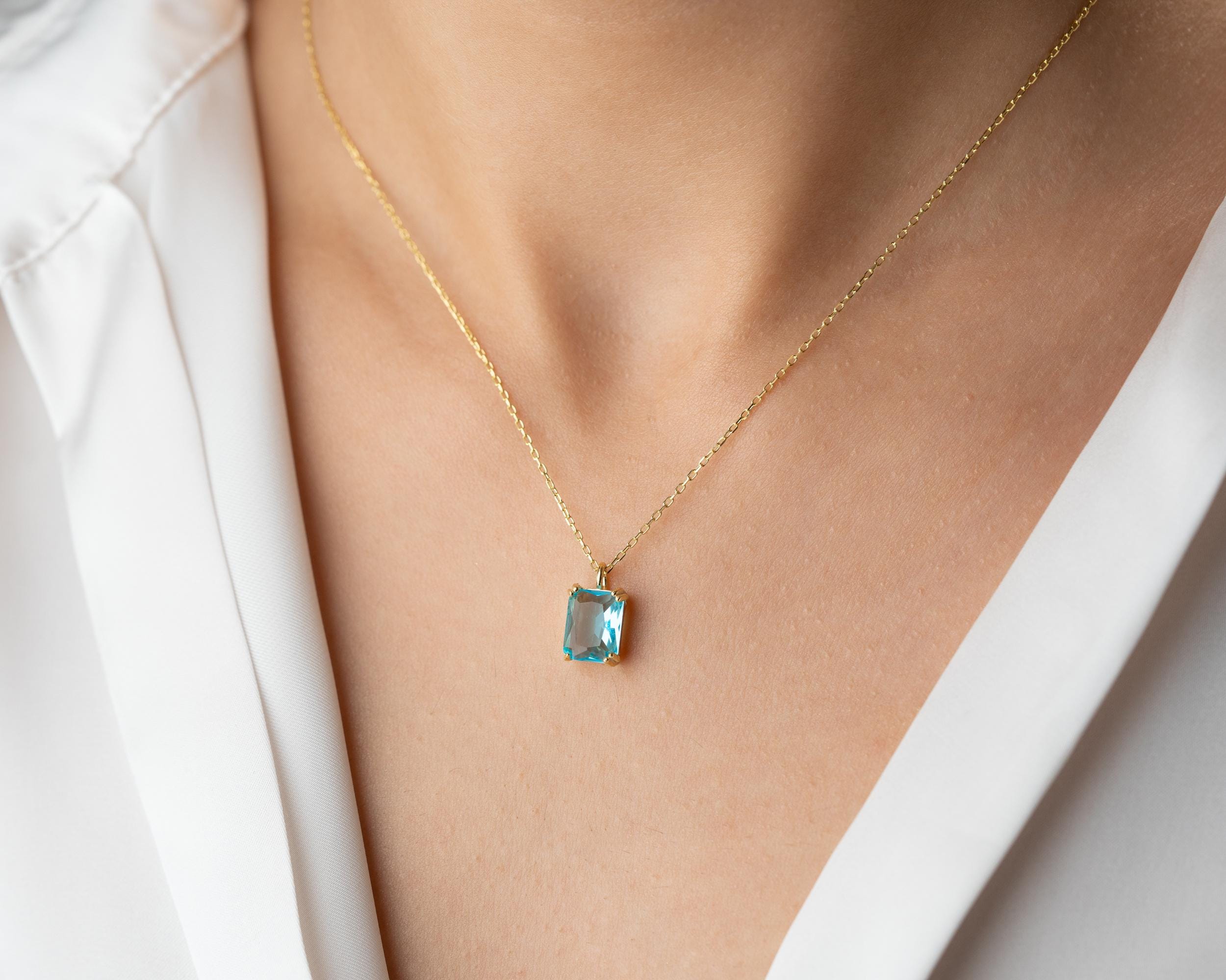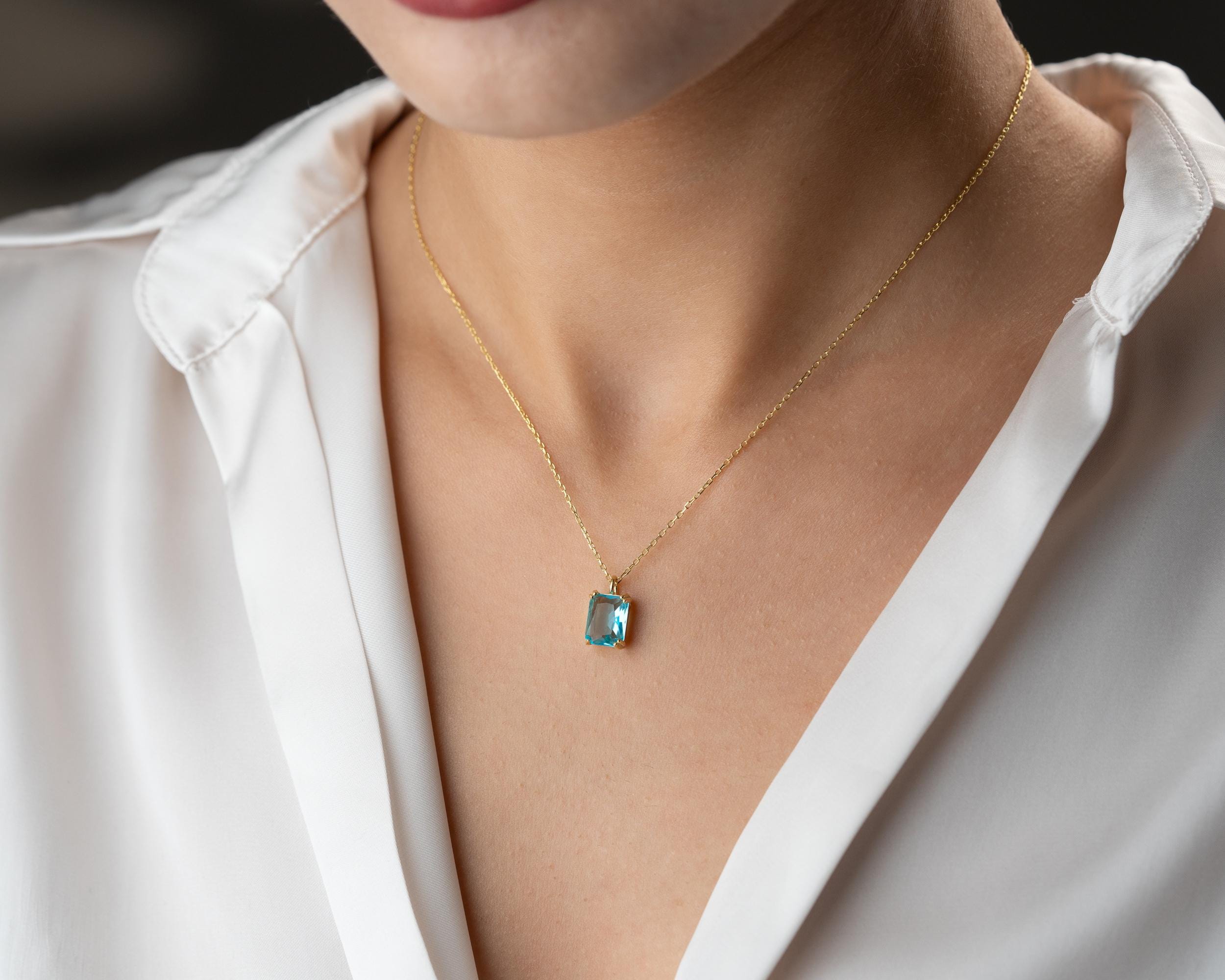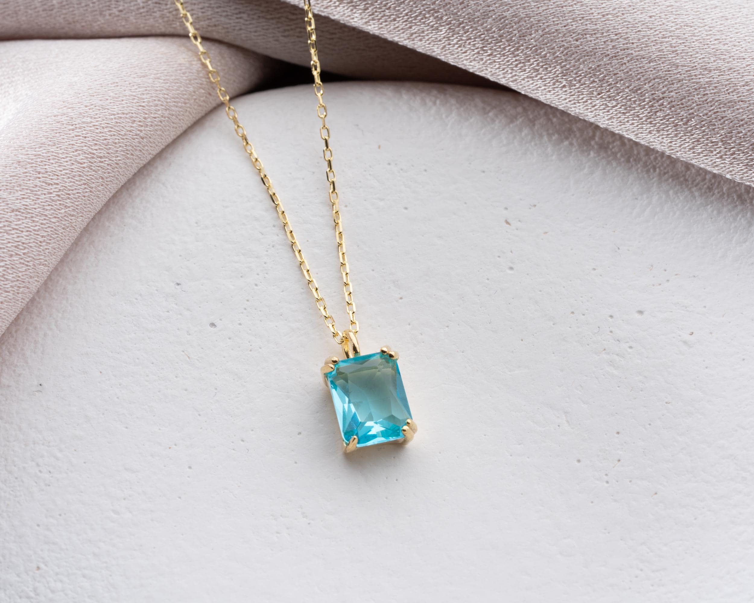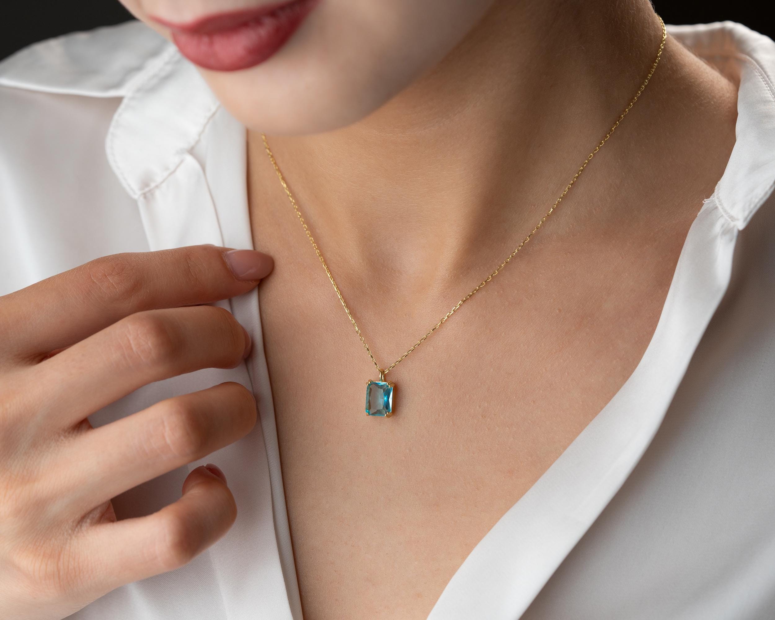 Delicate, radiant, and effortlessly elegant — this aquamarine blue pendant necklace brings a refreshing touch of ocean-inspired calm to your jewelry collection. The emerald-cut cubic zirconia stone (7x9mm) sparkles with a cool sky-blue hue, capturing light with every movement and reflecting tranquility and grace.