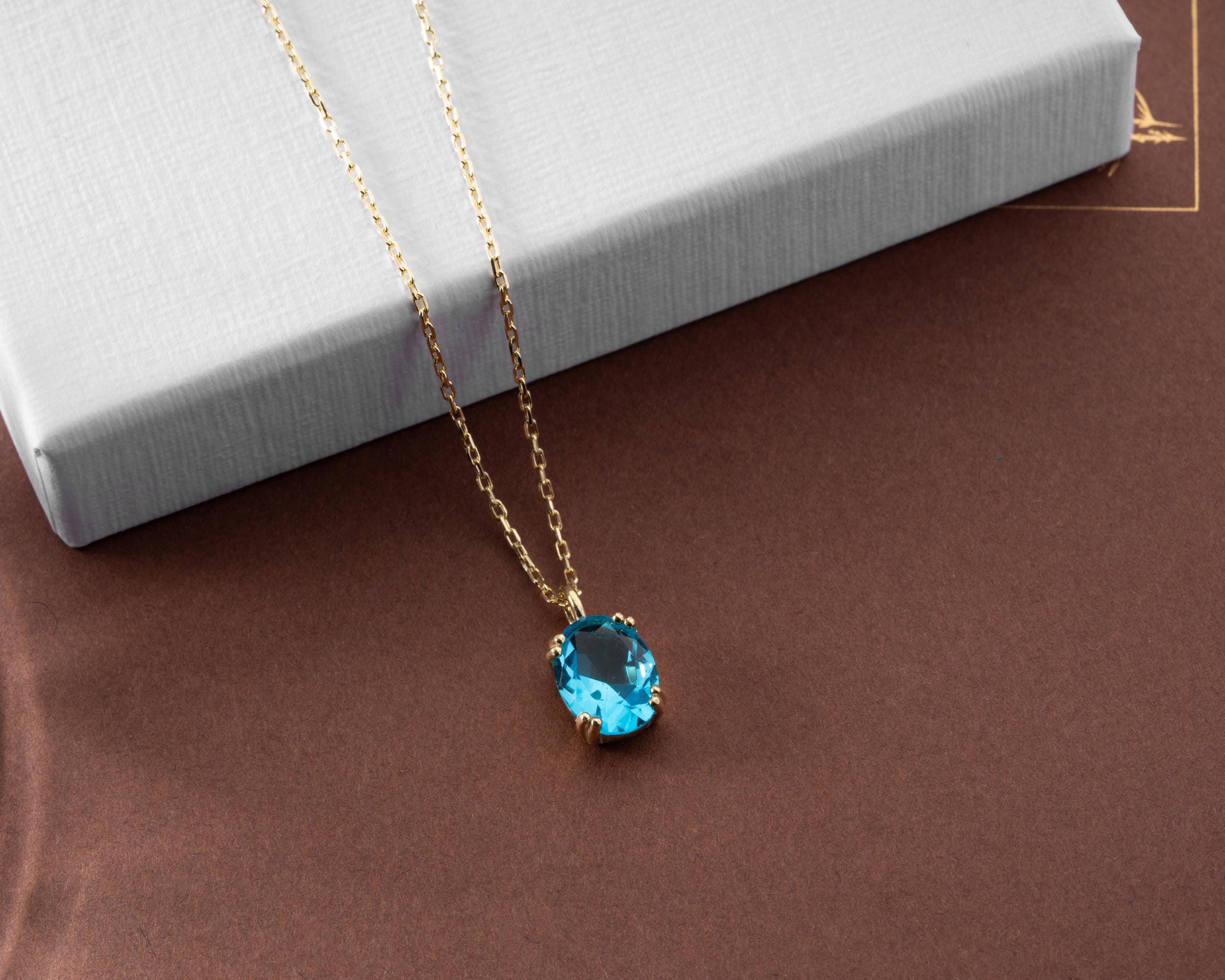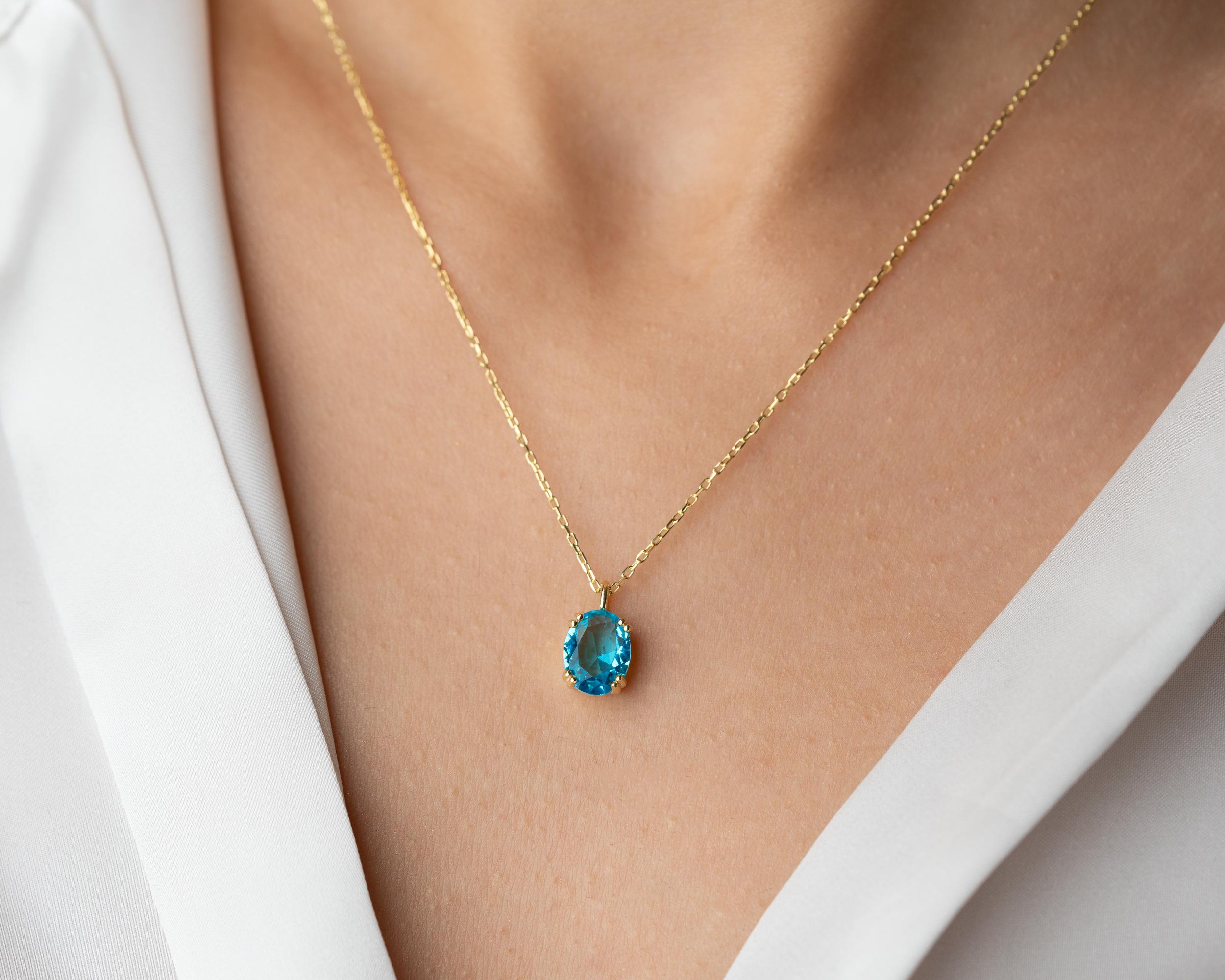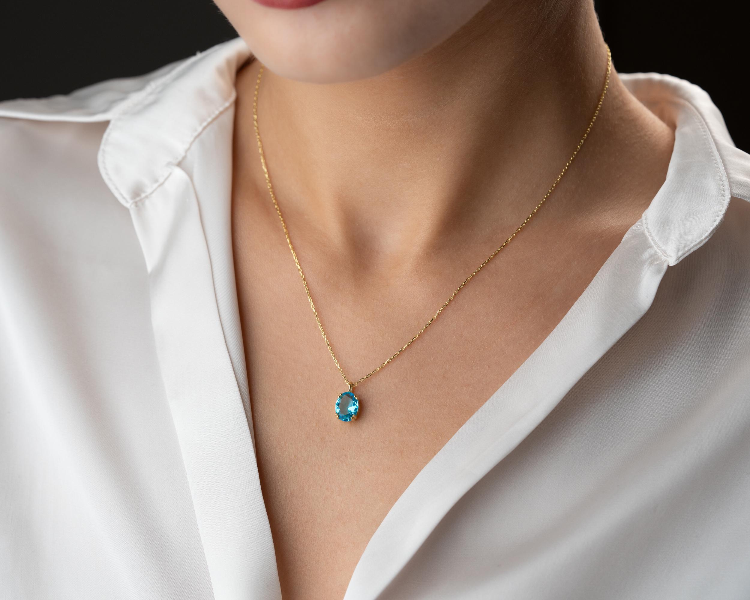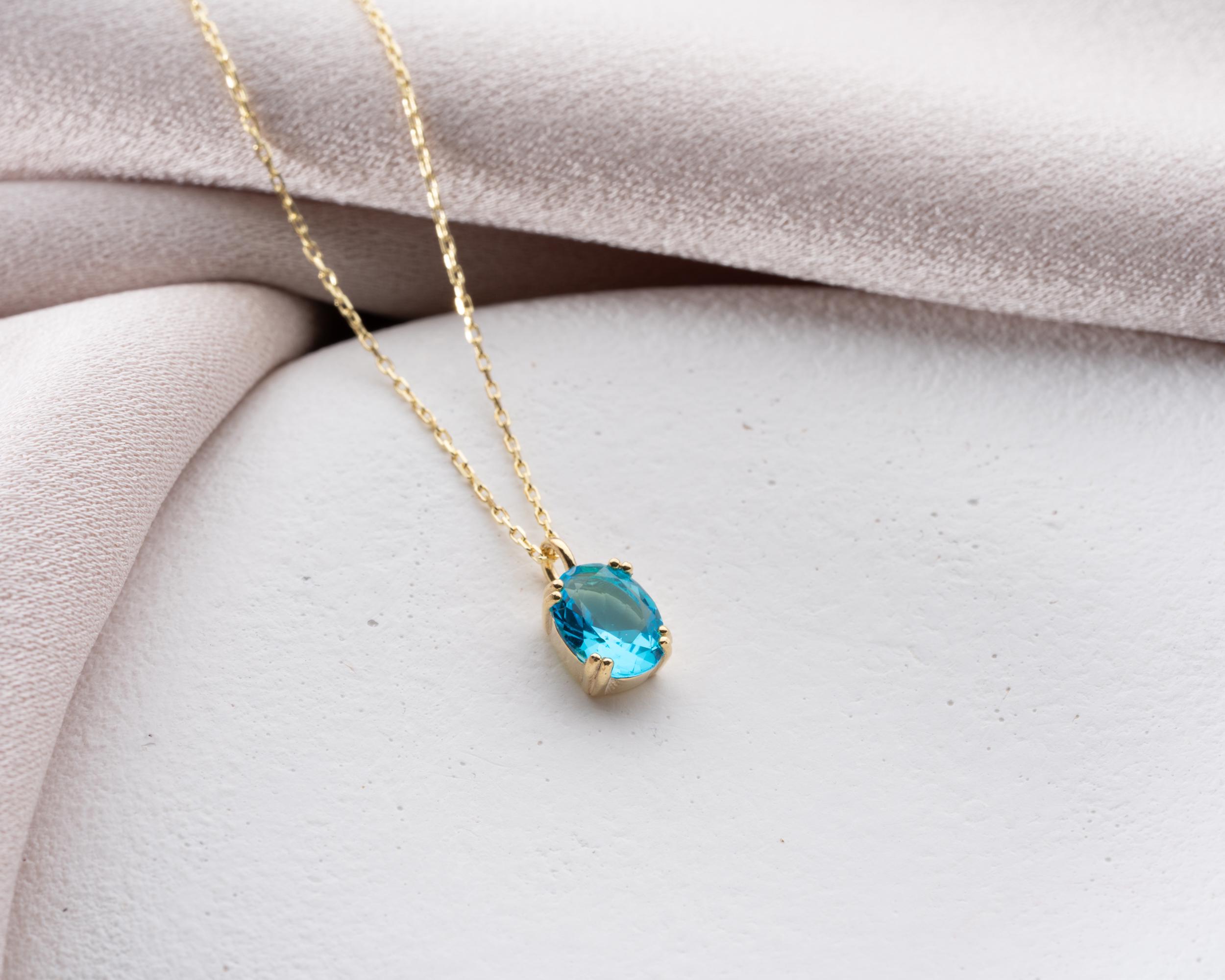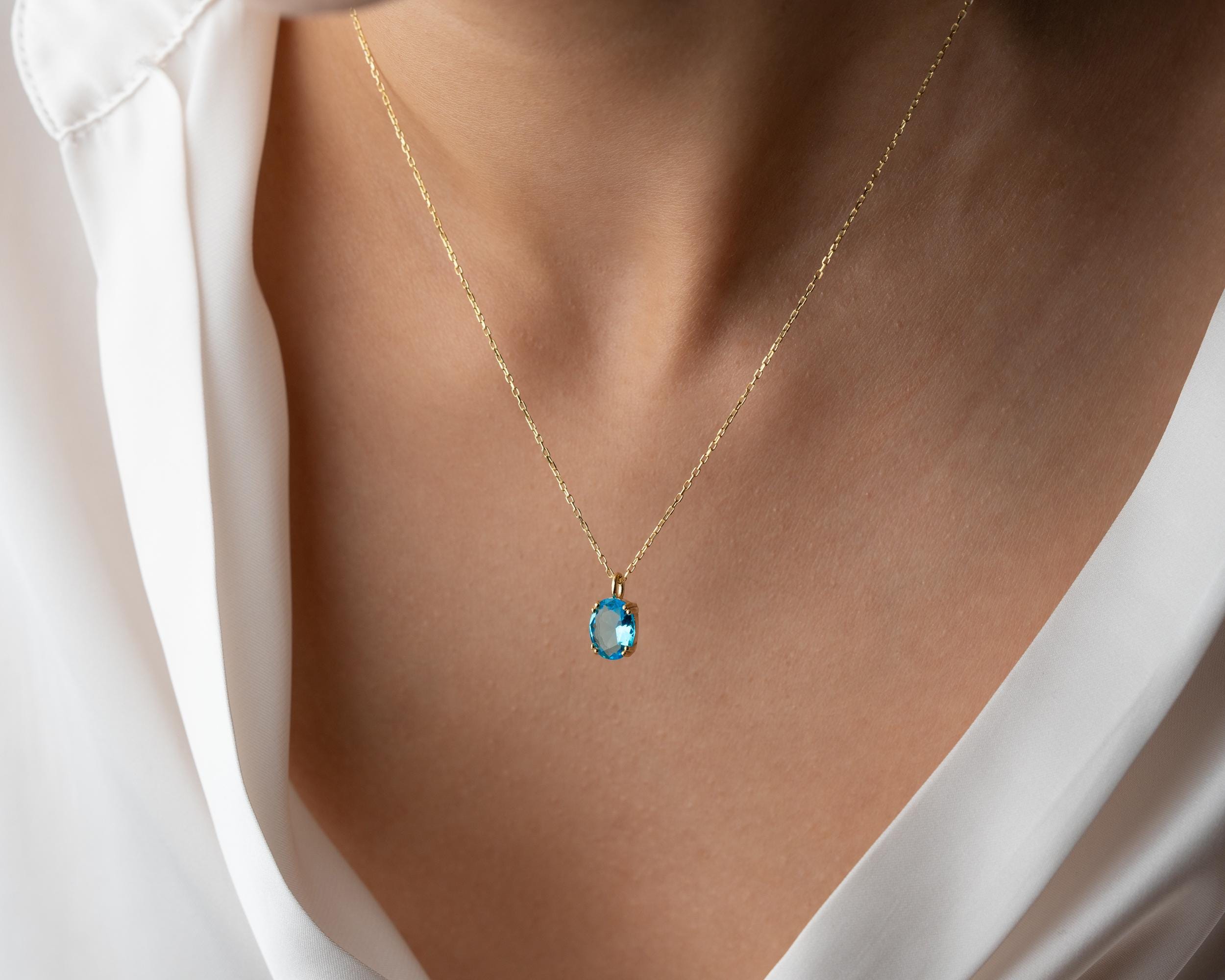 The oval-cut blue topaz stone (7x9mm) radiates elegance and sophistication, bringing a graceful balance between simplicity and luxury. Its ocean-inspired color makes it ideal for both everyday wear and special occasions — whether layered with other gold necklaces or worn as a statement piece on its own.