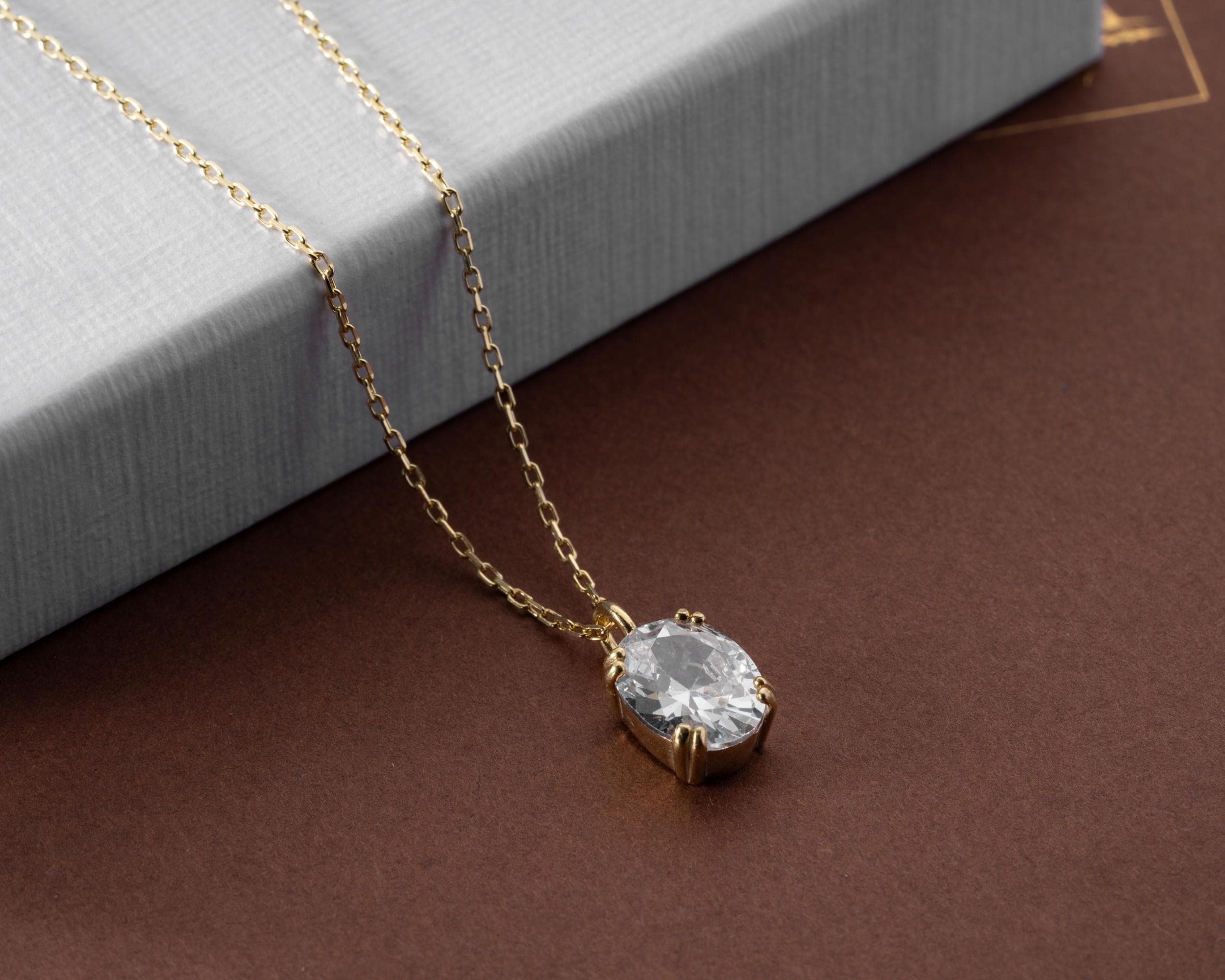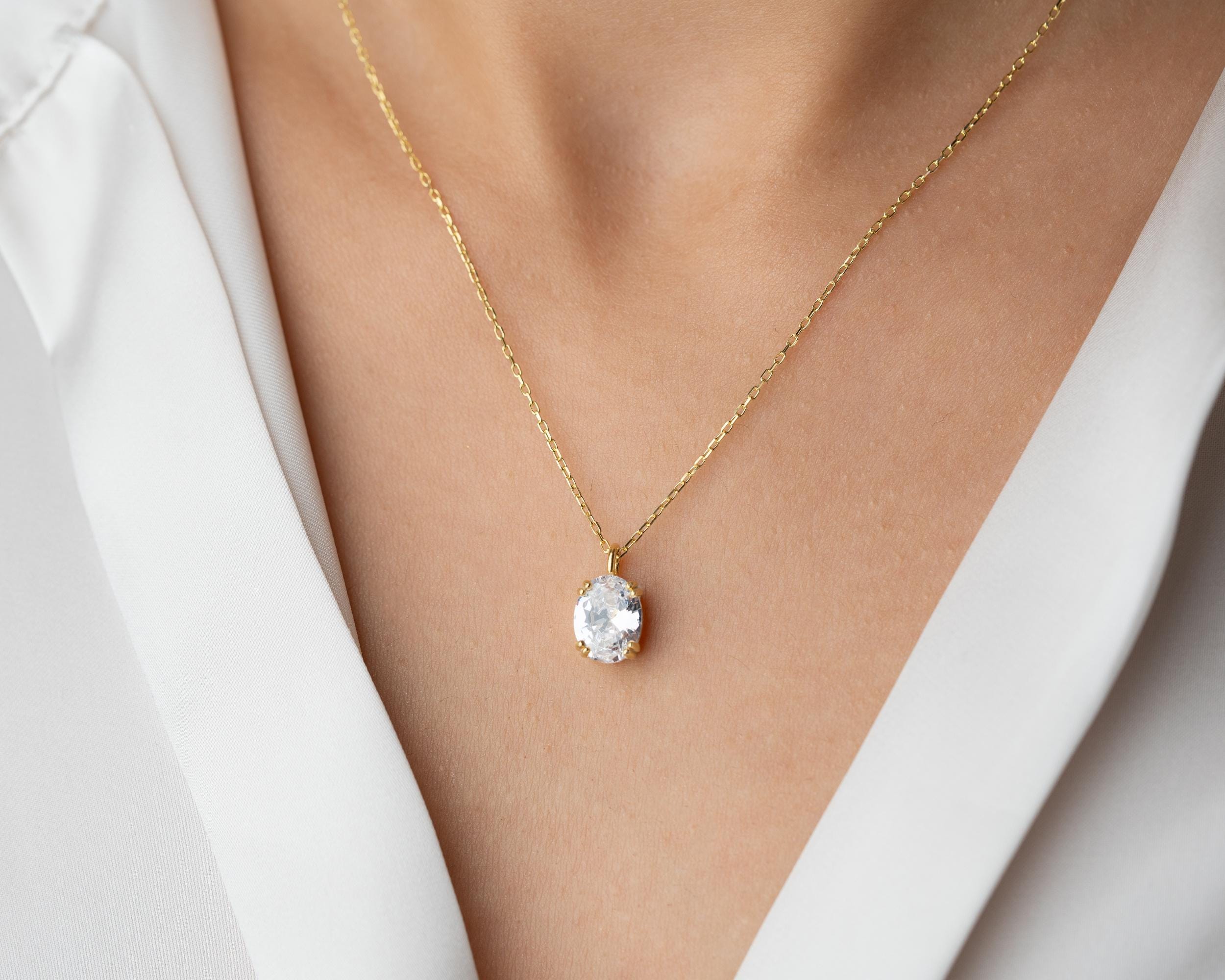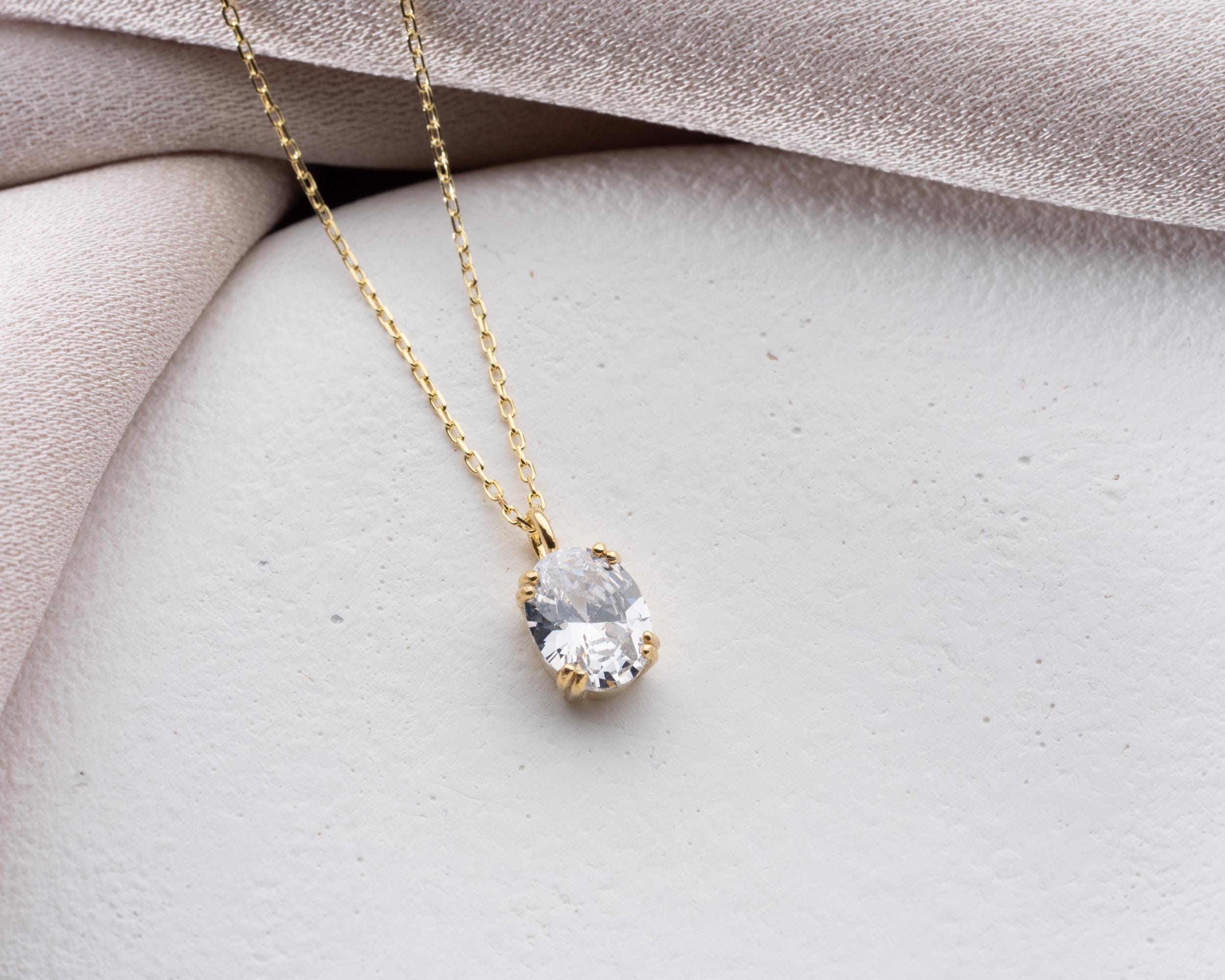 Each pendant is meticulously handcrafted from solid 925 sterling silver, finished with a thick layer of 14K gold vermeil for a warm, lasting shine. The stone is secured in a classic four-prong setting that allows maximum light reflection while maintaining a sleek, minimalist silhouette. Hanging from a fine gold chain, the pendant rests delicately against the collarbone — perfect for layering or wearing solo as a statement of refined simplicity.