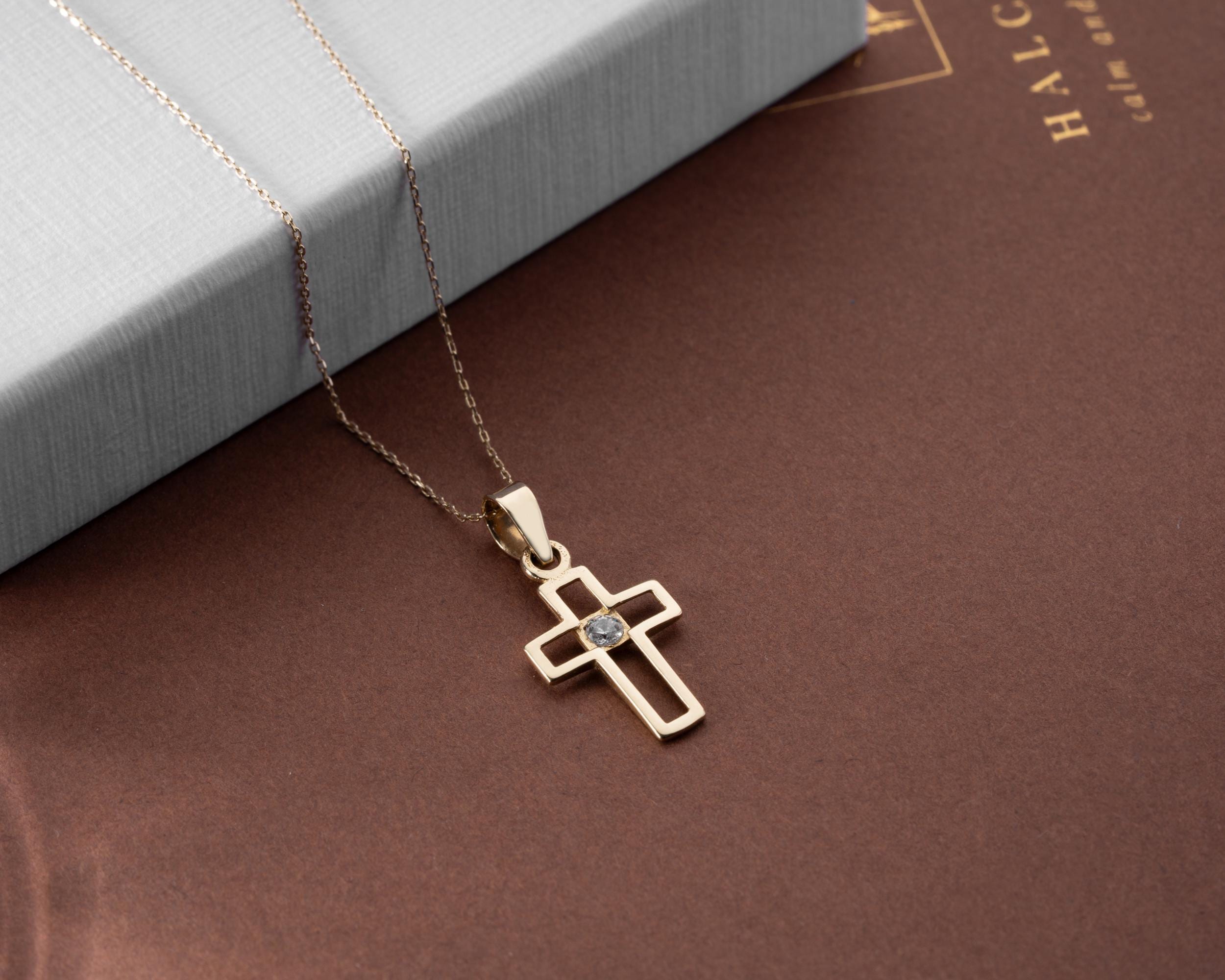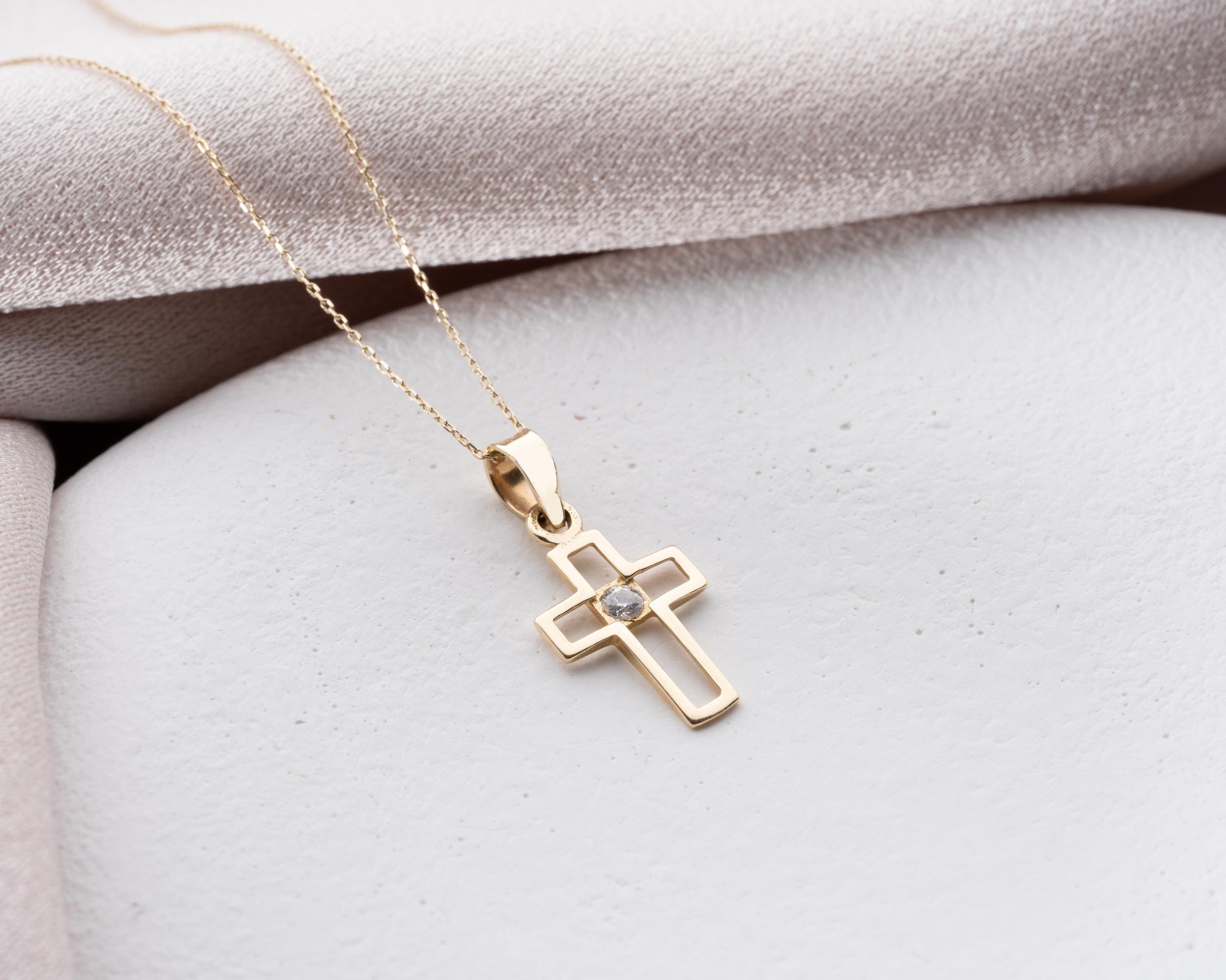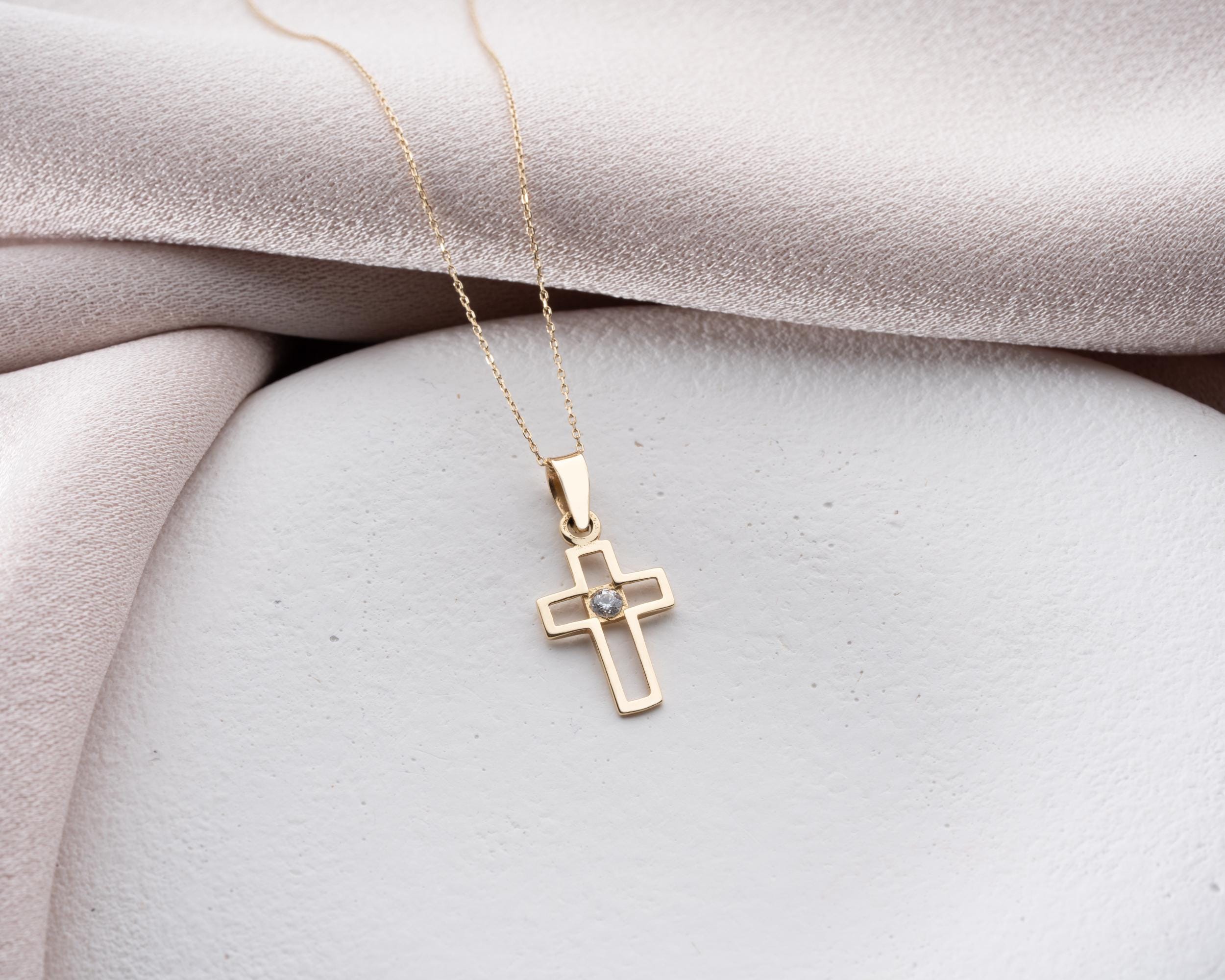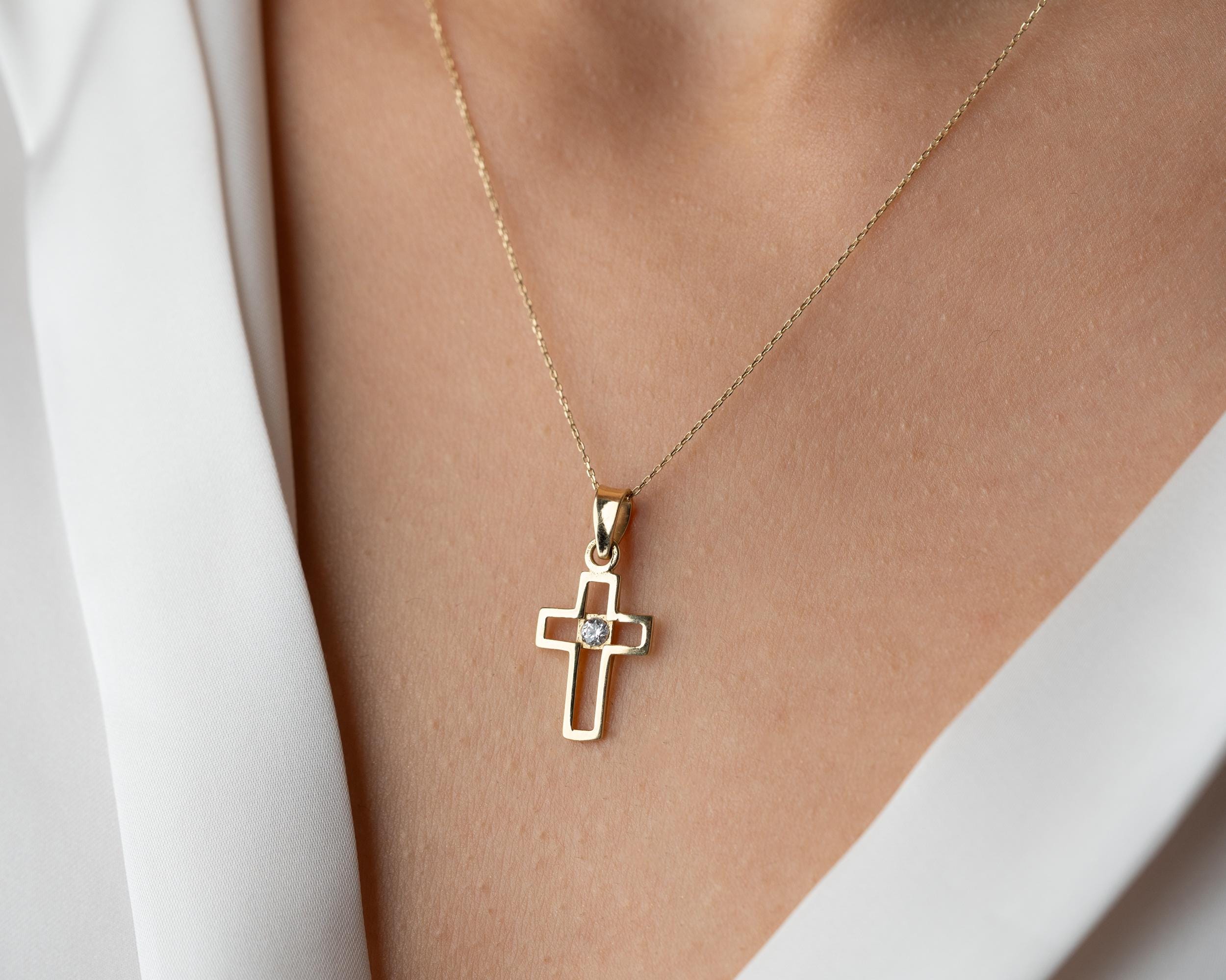 Graceful and timeless, this handmade 14K solid gold cross necklace is designed to be both meaningful and elegant. Crafted with meticulous attention to detail, the open cross pendant features a delicate genuine diamond-cut cubic zirconia (CZ) at its center — symbolizing light, purity, and faith. Its minimalist silhouette and high-polished finish make it a perfect everyday necklace or a heartfelt gift for any special occasion.