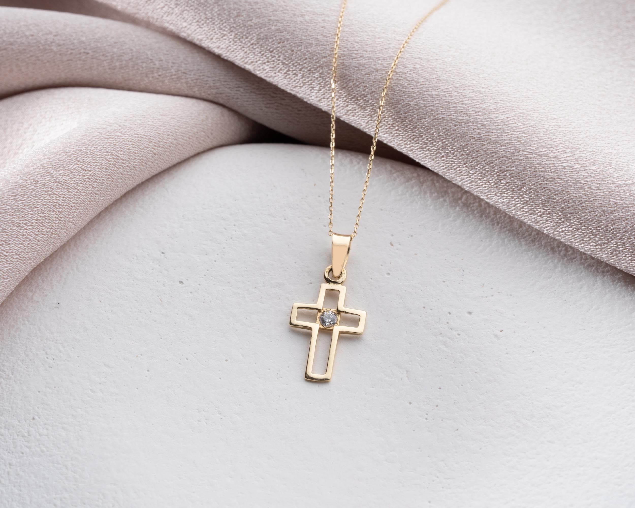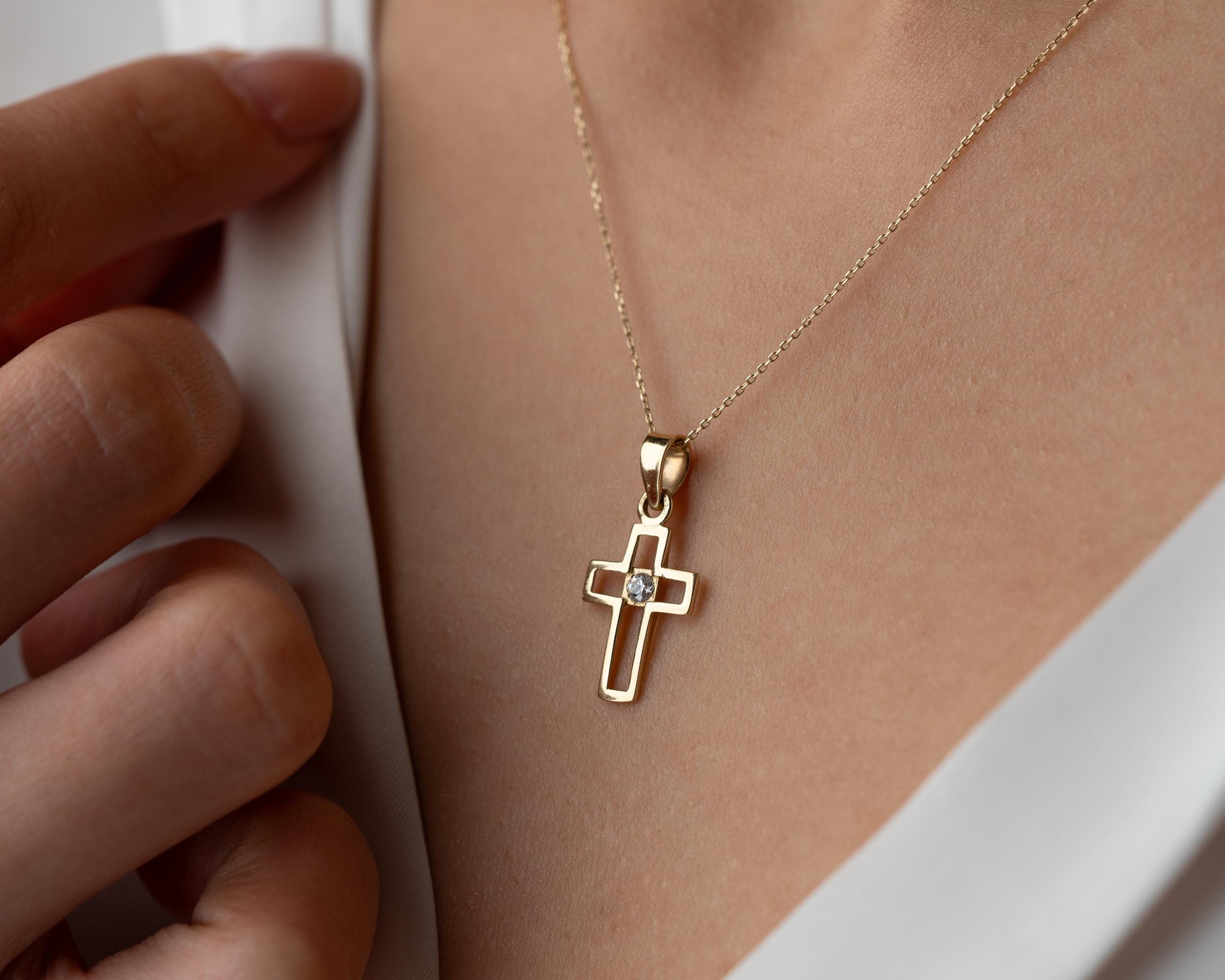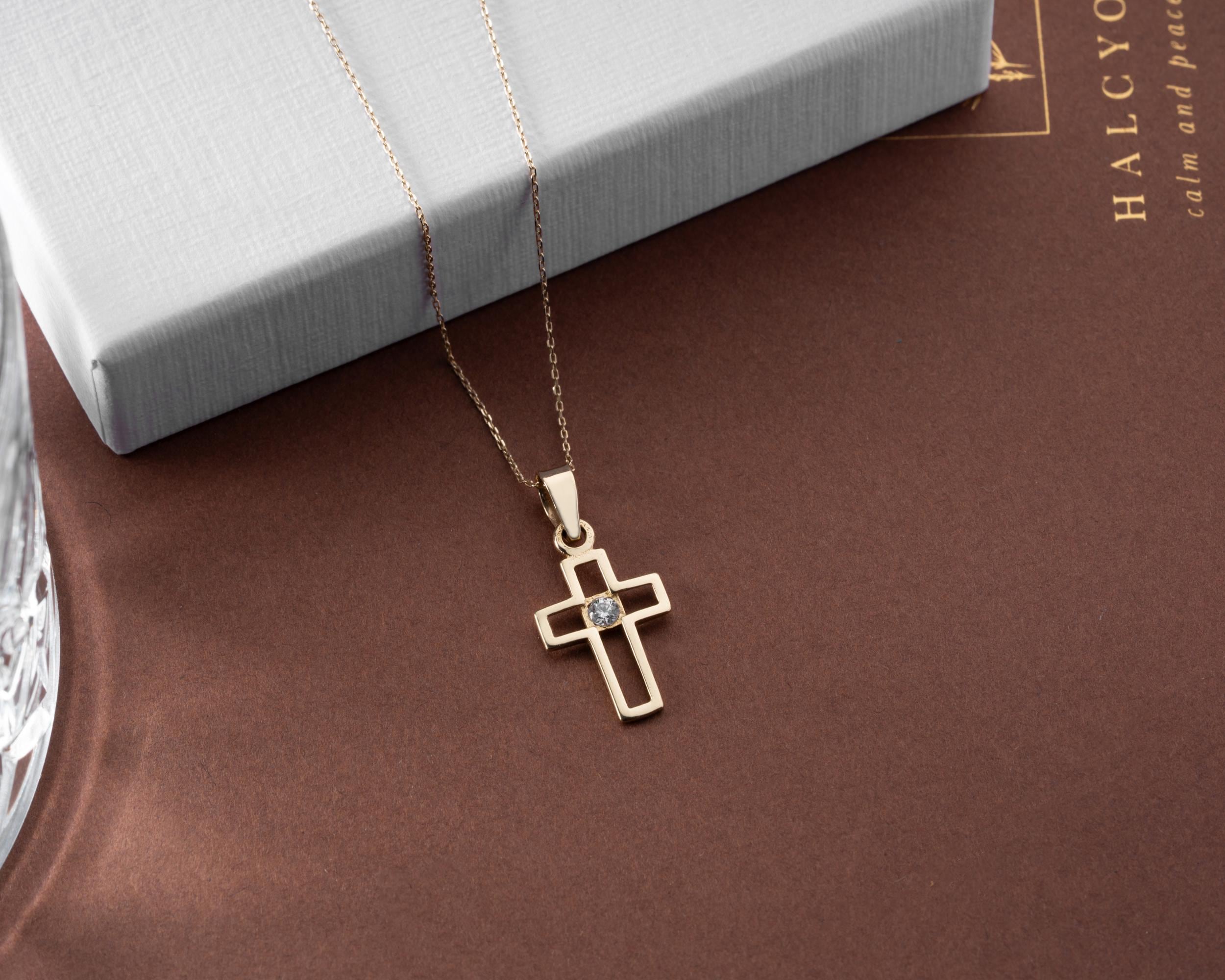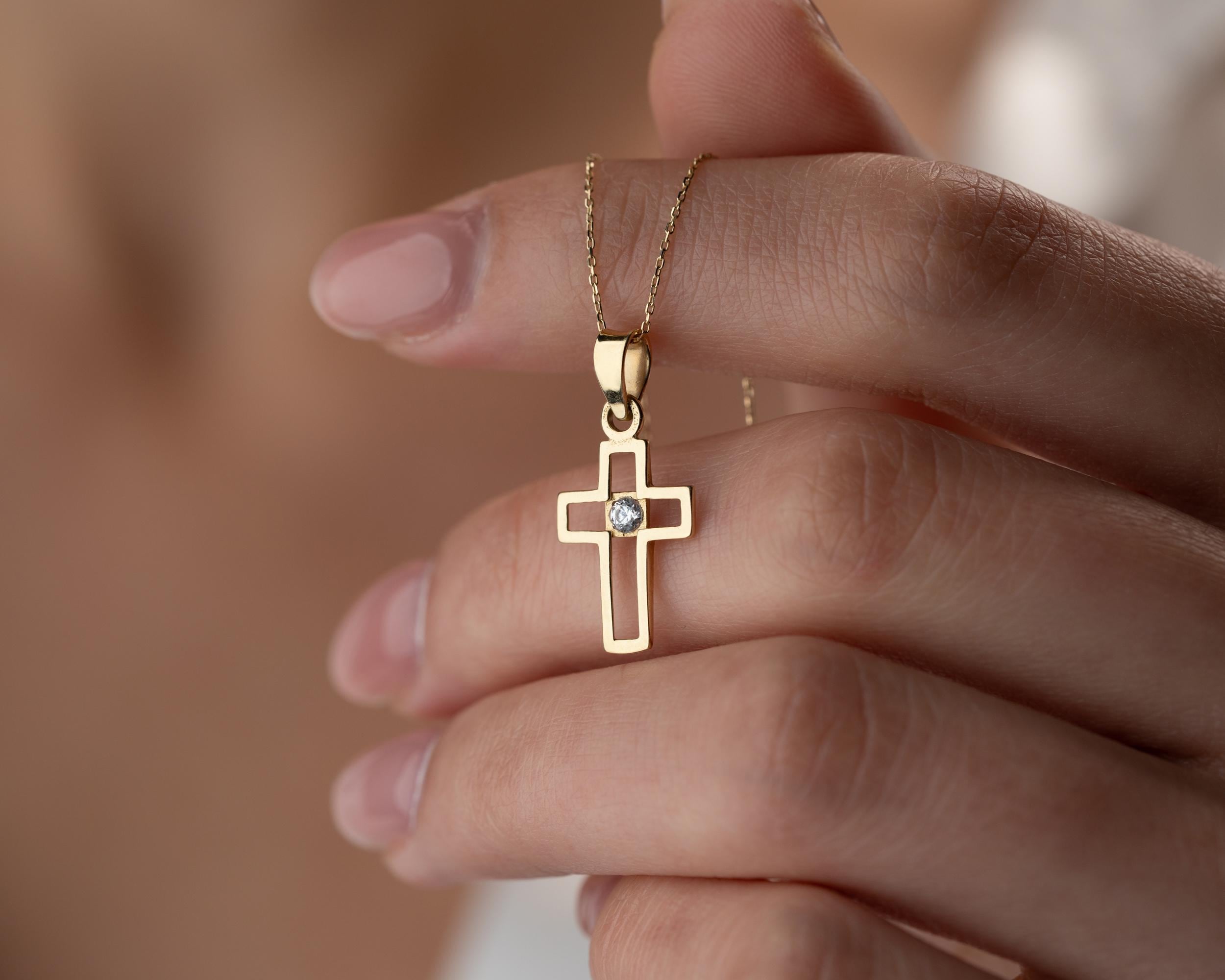 Graceful and timeless, this handmade 14K solid gold cross necklace is designed to be both meaningful and elegant. Crafted with meticulous attention to detail, the open cross pendant features a delicate genuine diamond-cut cubic zirconia (CZ) at its center — symbolizing light, purity, and faith. Its minimalist silhouette and high-polished finish make it a perfect everyday necklace or a heartfelt gift for any special occasion.