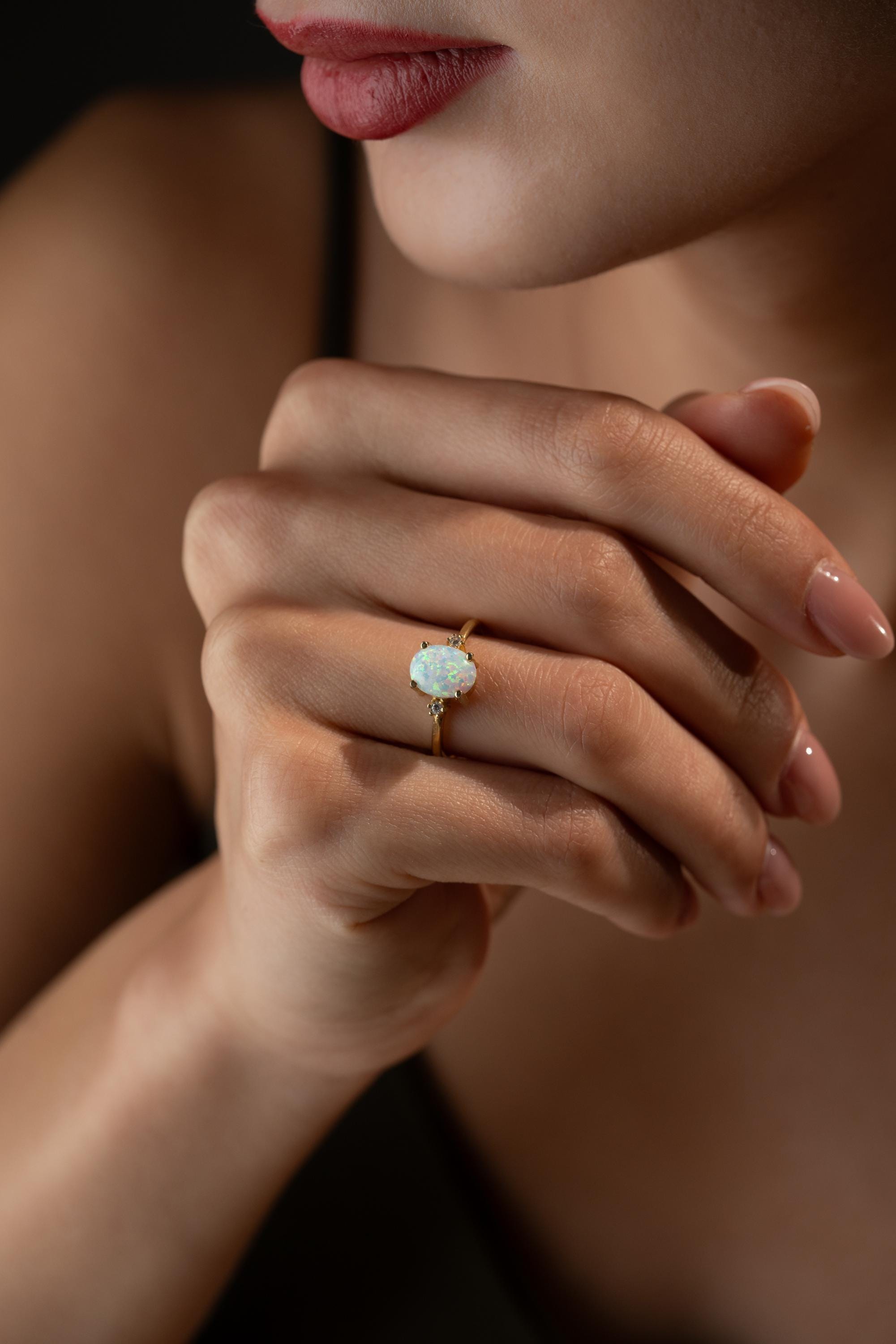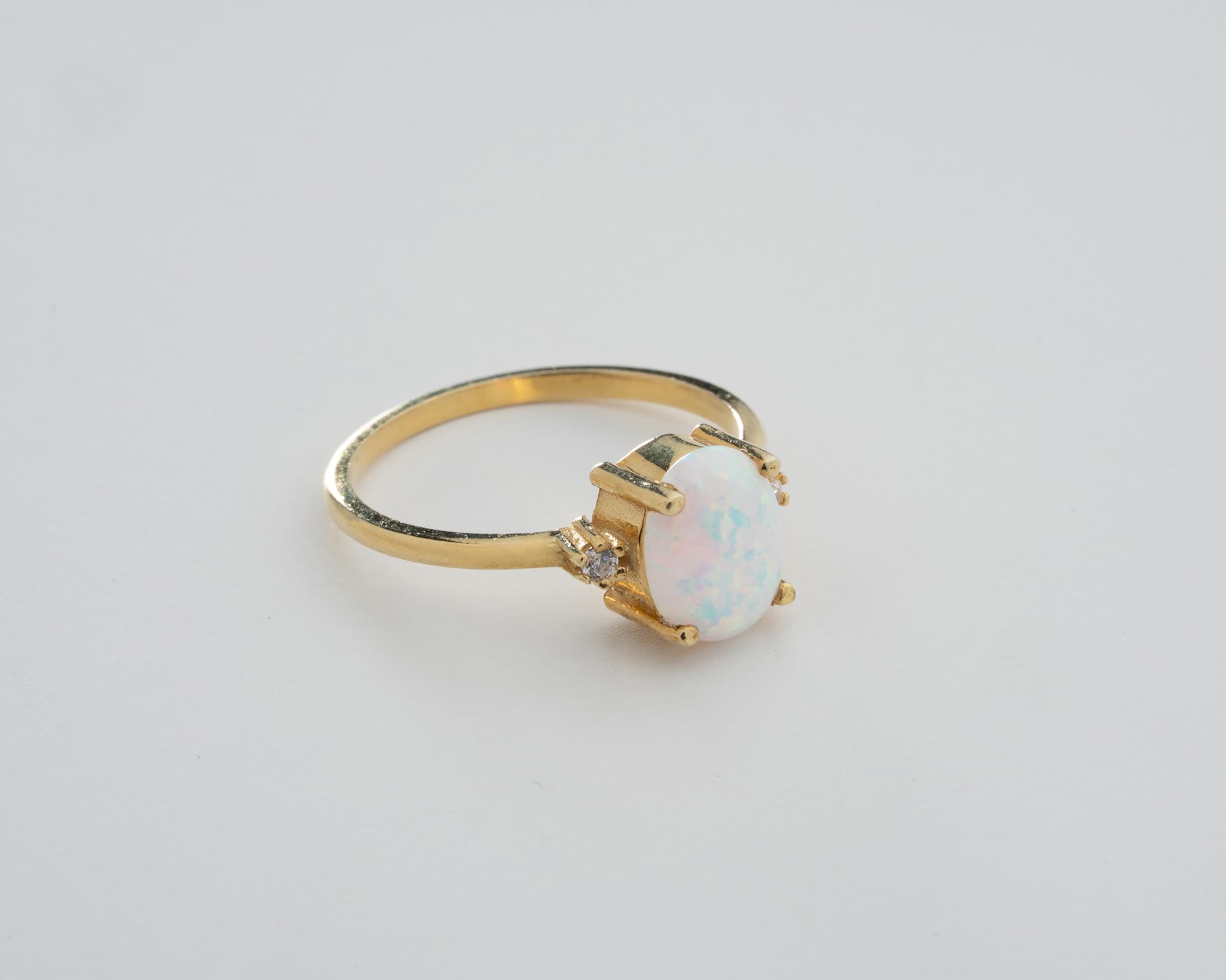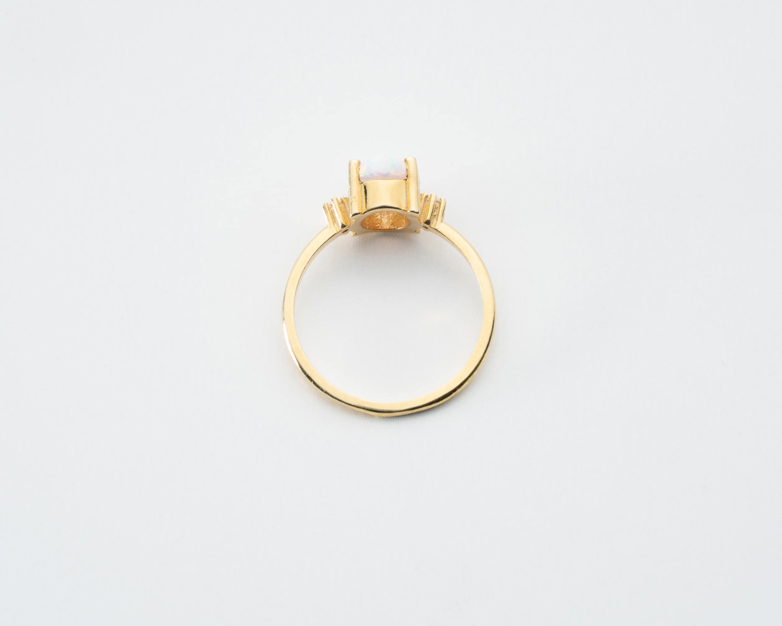 A timeless and elegant piece designed to capture the ethereal beauty of opal. This handcrafted ring features a radiant oval-cut opal set in luxurious gold vermeil (a thick layer of 18K gold over solid 925 sterling silver) and adorned with two sparkling cubic zirconia stones on each side. The opal’s natural play-of-color shifts beautifully under light, reflecting hues of pink, blue, green, and gold for a truly mesmerizing look.