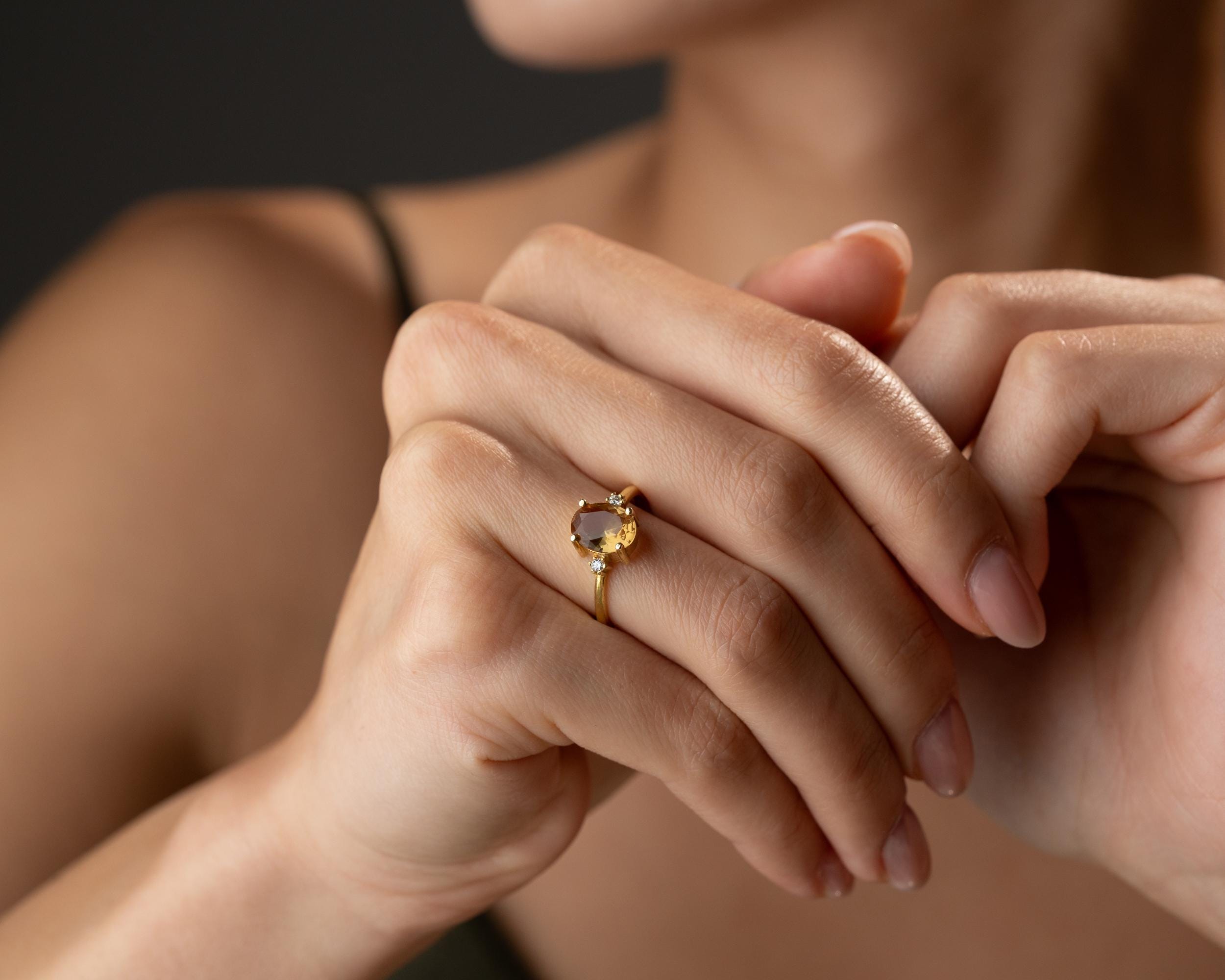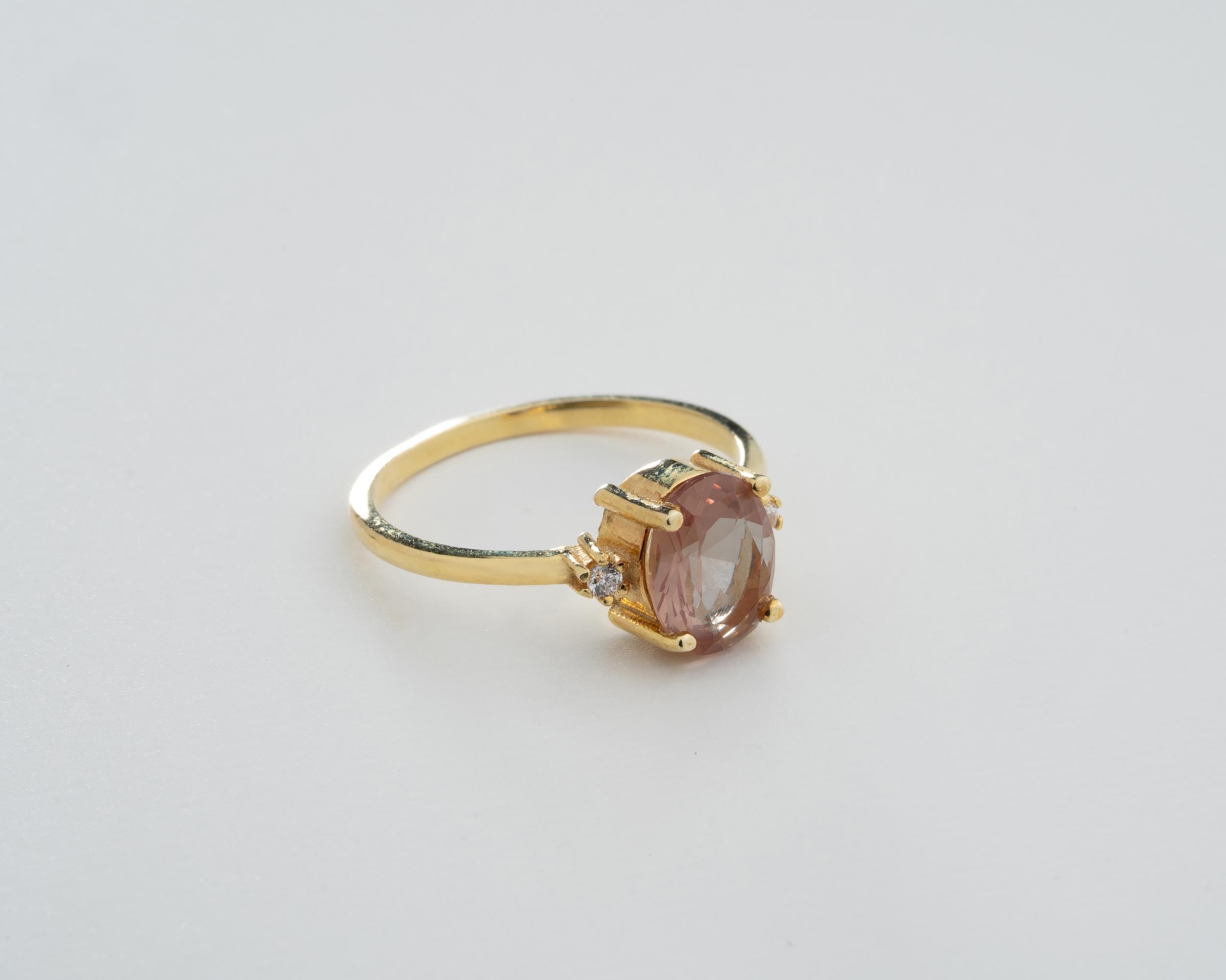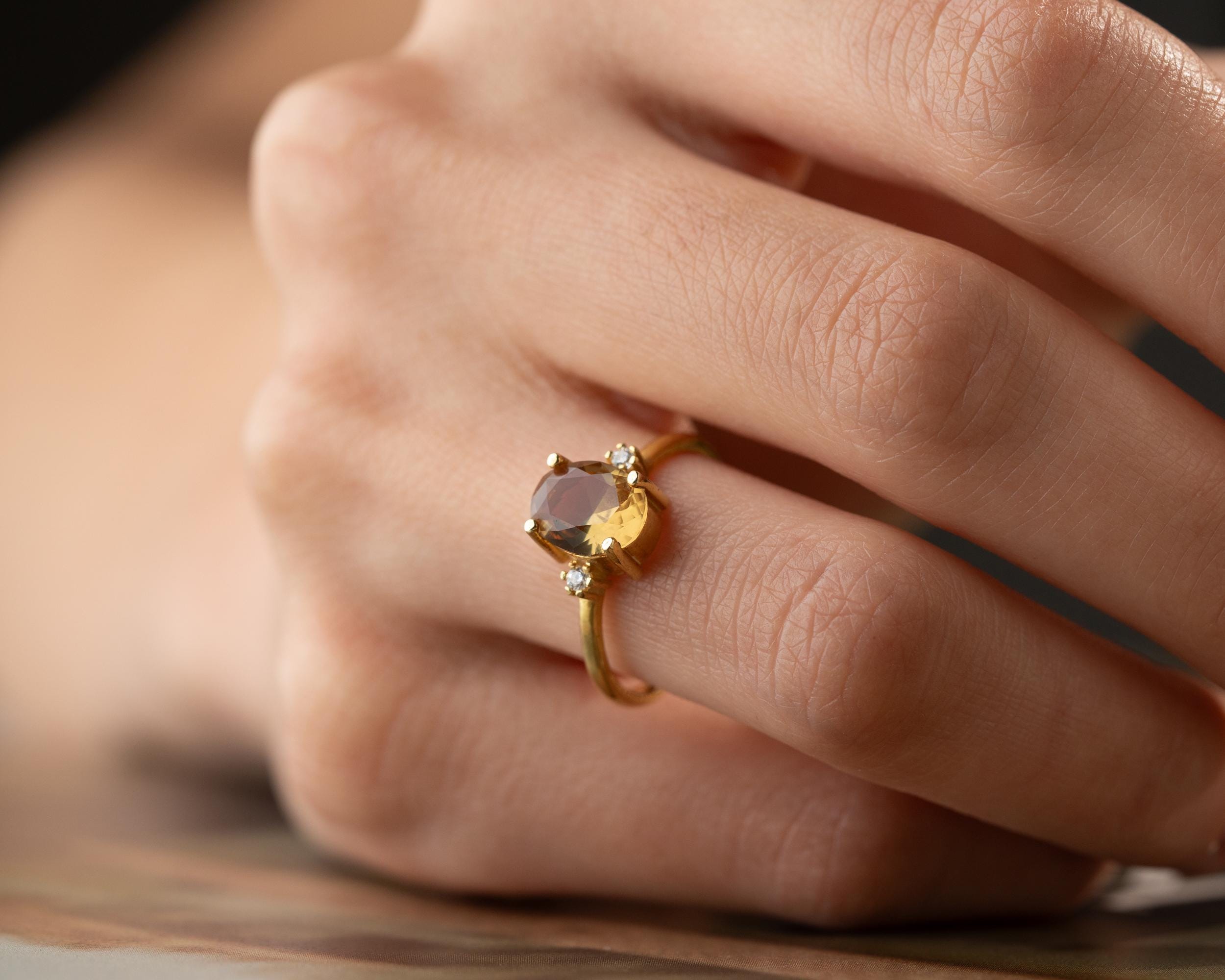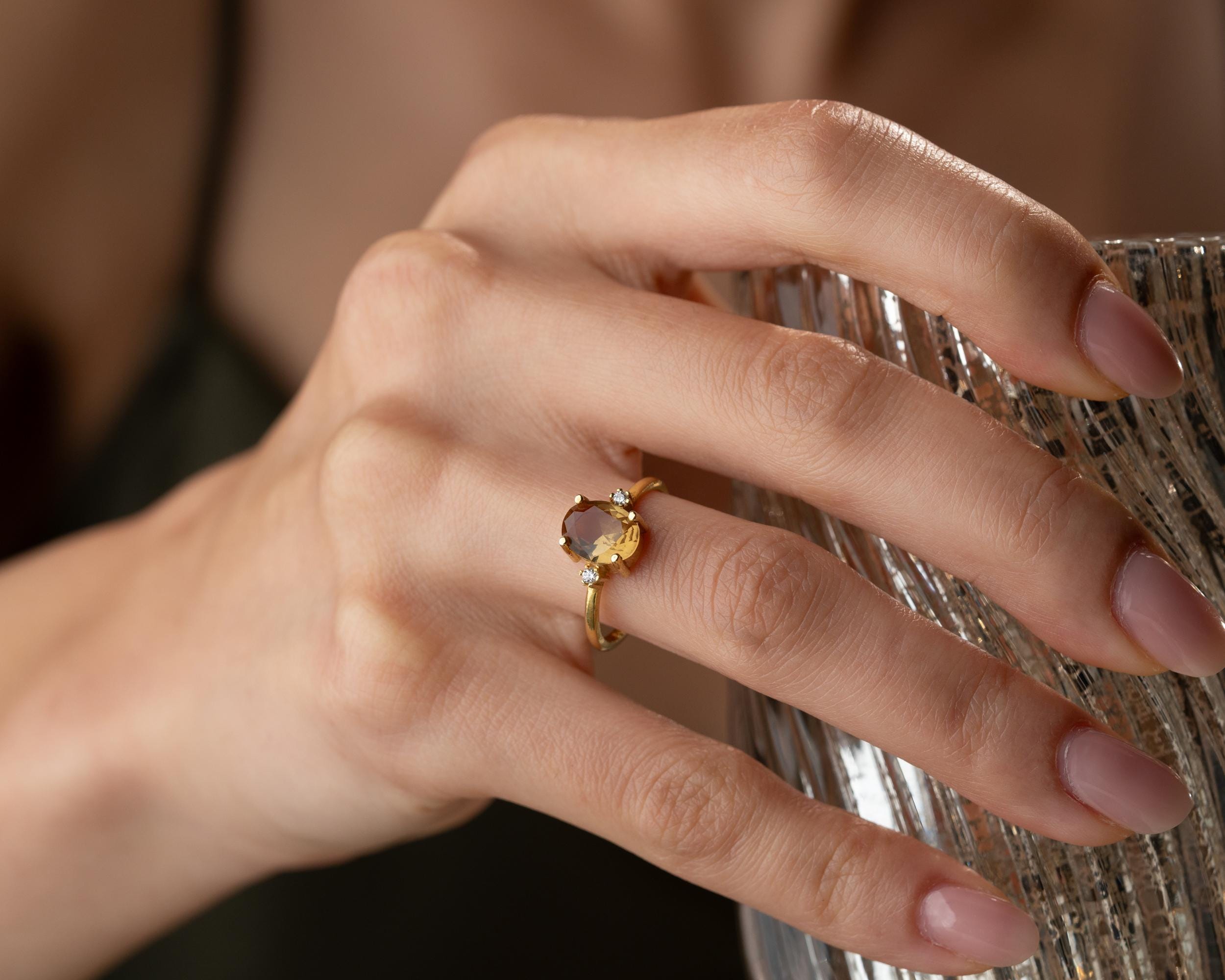 Elegant, enchanting, and endlessly unique — this 14K gold vermeil ring features a genuine oval-cut Zultanite that changes color beautifully under different light. In daylight, it glows with golden-green and champagne tones; under indoor lighting, it transforms into soft rose and pinkish hues. Two sparkling white cubic zirconia or simulated diamonds accent the center stone, adding extra brilliance and balance.