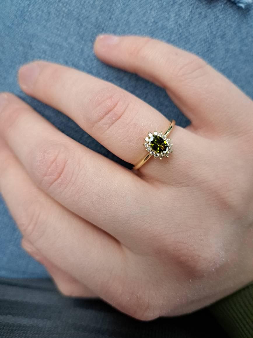 Antique Style Peridot Ring • Oval Green Stone with CZ Halo • Gold Plated Dainty Ring • Classic Vintage Jewelry Gift